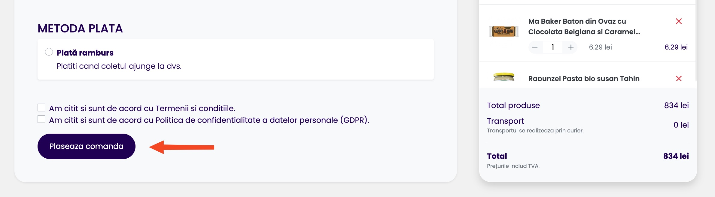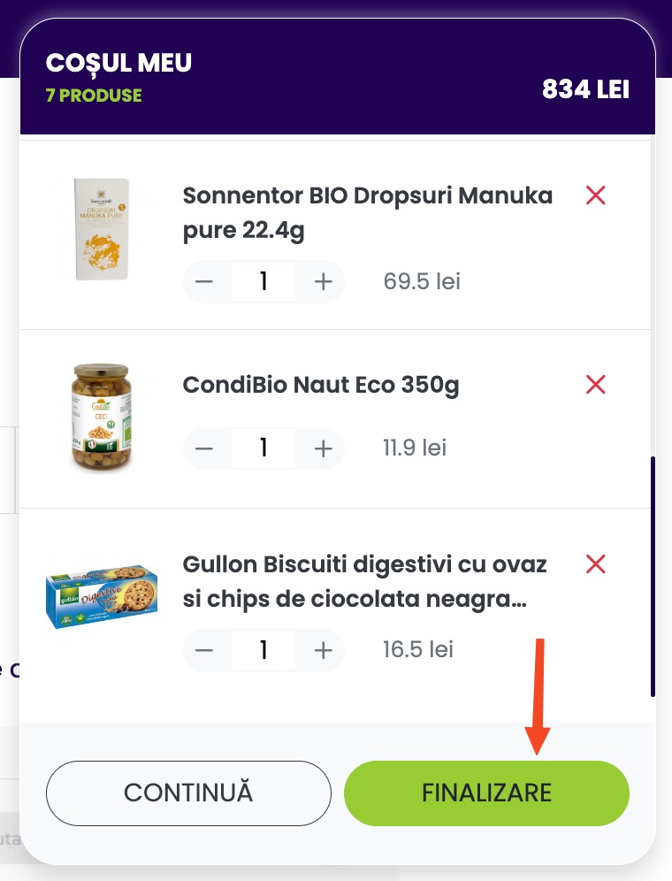 Dupa ce ați adaugat toate produsele în cos, deschideți fereastra de checkout din partea dreapta sus a site-ului. Oricând se pot șterge produse apăsând buton "x" sau adauga noi produse la coșul de cumpărături. Când toate produsele sunt adăugate se apasă butonul "FINALIZARE COMANDĂ".