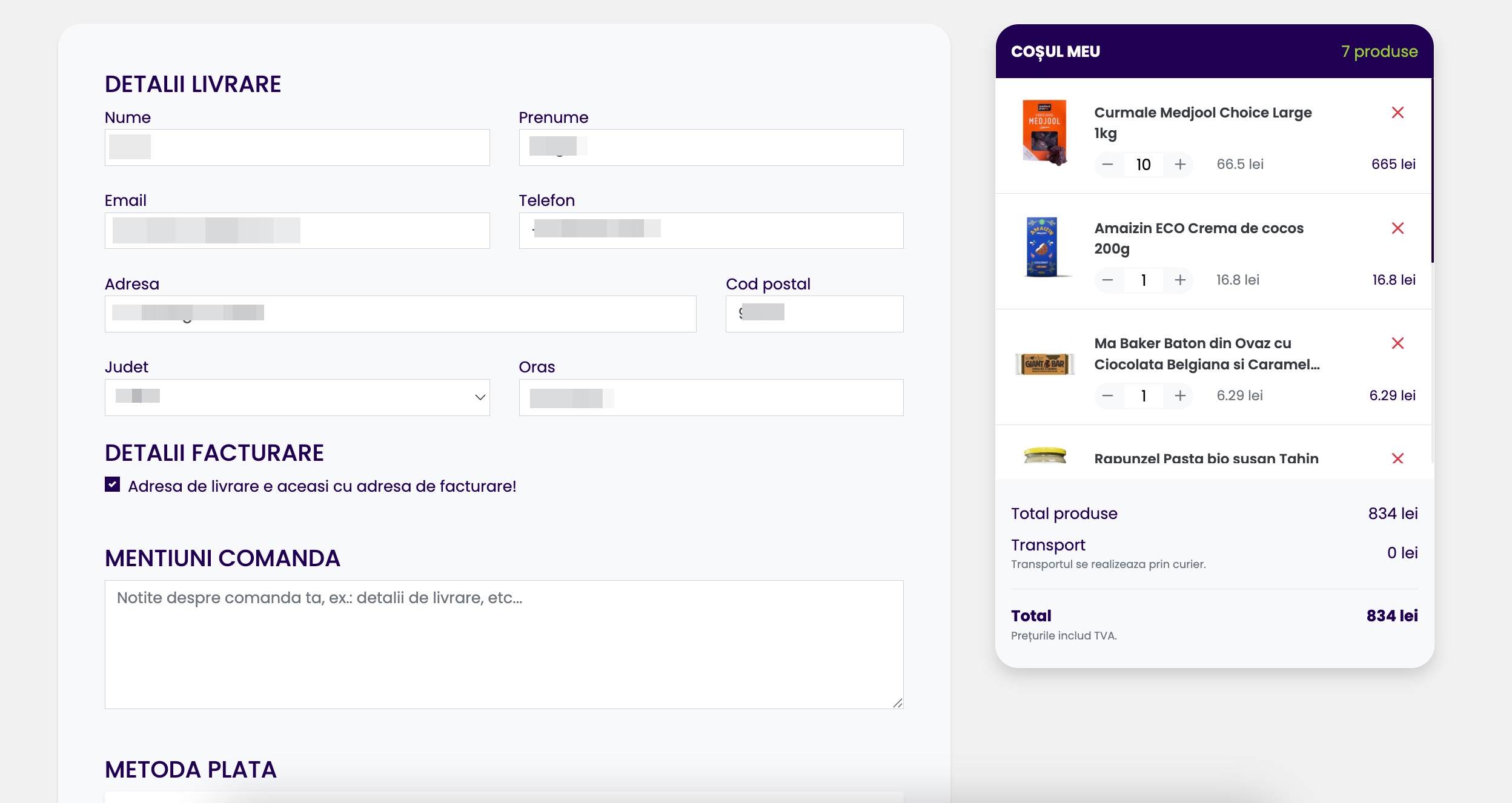Pentru a finaliza comanda, trebuie să completați detaliile de livrare și facturare. În caz că adresa de livrare și facturare sunt identice se bifează acea căsuță apoi se selectează metoda de plată. Pentru un istoric al comenzilor este recomandat să vă logați într-un cont, apasați butonul "Vreau cont" în caz că doriți să vă înregistrați.