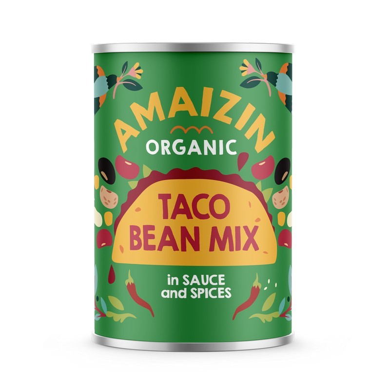 Mixul de fasole ecologica pentru taco Amaizin este un amastec de 5 tipuri de fasole in sos de rosii bine condimentat.