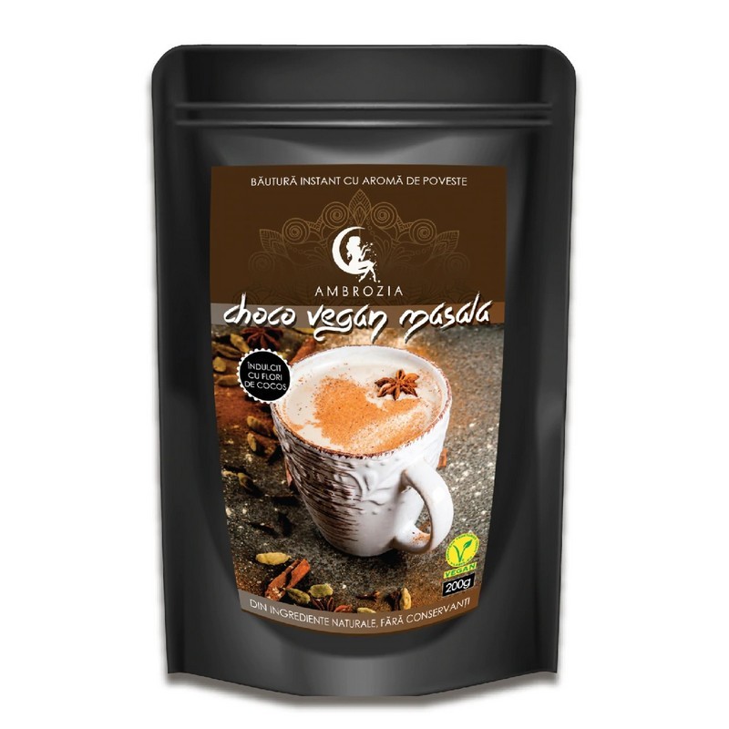 Ingrediente: nectar granulat de cocos, lapte instant de soia integral (nemodificata genetic), pudra de cacao naturala, cardamom, scortisoara, cuisoare, anason stelat, ghimbir, coriandru.