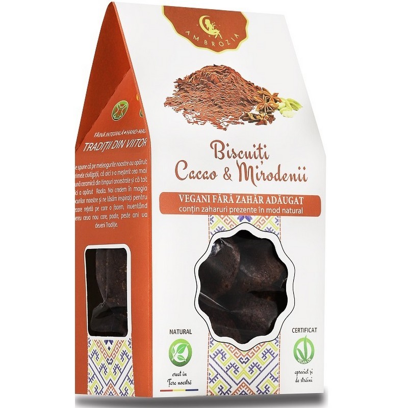 Ingrediente: faina integrala de grau, sirop de struguri, ulei de floarea soarelui, fulgi de ovaz, pudra de cacao naturala (12%), amestec de condimente exotice (2%): anason stelat, cuisoare, cardamom, scortisoara, ghimbir. Produs intr-o unitate unde se proceseaza soia, nuci, fructe cu coaja lemnoasa si fainuri cu gluten.