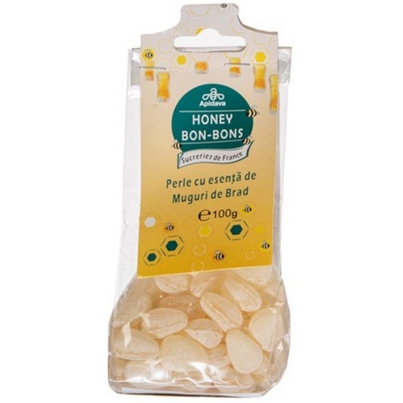 Dropsuri cu miere și esența naturală de muguri de brad. Fabricate în Franța după o rețetă tradițională, bomboanele cu miere sunt adevărate delicatese, apreciate pentru gustul și aroma ingredientelor apicole.