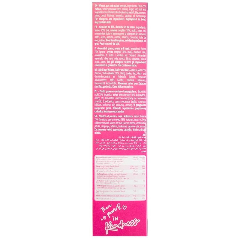 Ingrediente: Faina 74% [grau 47%, ovaz integral 14%, porumb 13%], zahar, sare, concentrat de fructe si legume pentru colorant alimentar (ridiche, coacaze negre, mar, morcov, hibiscus, turmeric), ulei de cocos, arome.