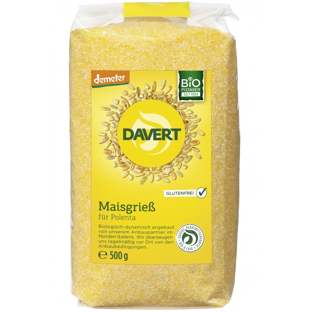 Gris de porumb bio Davert pentru mamaliga. Delicios ca garnitura cu legume sau peste fie ca fel principal preparat cu ciuperci usturoi si branza sau ca desert cu quark sau fructe. Imaginatia nu cunoaste limite Pentru a face mamaliga boabele de porumb sunt macinate in gris.