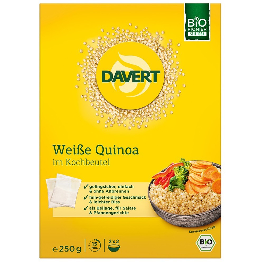 Quinoa alba Davert. Cand este preparata intr-o punga de fierbere quinoa devine deosebit de fina si granulata. Este gata de servit in doar 15 minute si este potrivit ca garnitura sau ca baza pentru mancaruri si salate.Pe langa continutul ridicat de fibre si magneziu quinoa este o sursa pretioasa de zinc si fier.