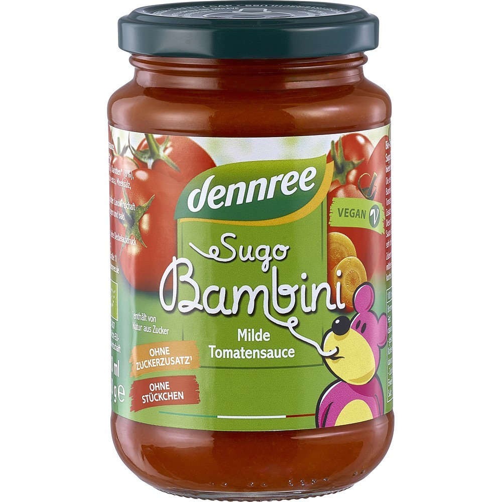 Dennree sos de rosii bio pentru copii Sugo Bambini. Sosul de rosii Sugo Bambini este facut din rosii si legume coapte la soare dupa o reteta traditionala. Acest sos usor condimentat este deosebit de popular printre copii. Bucurati-va de gustul fructat, blând, adorat de copii