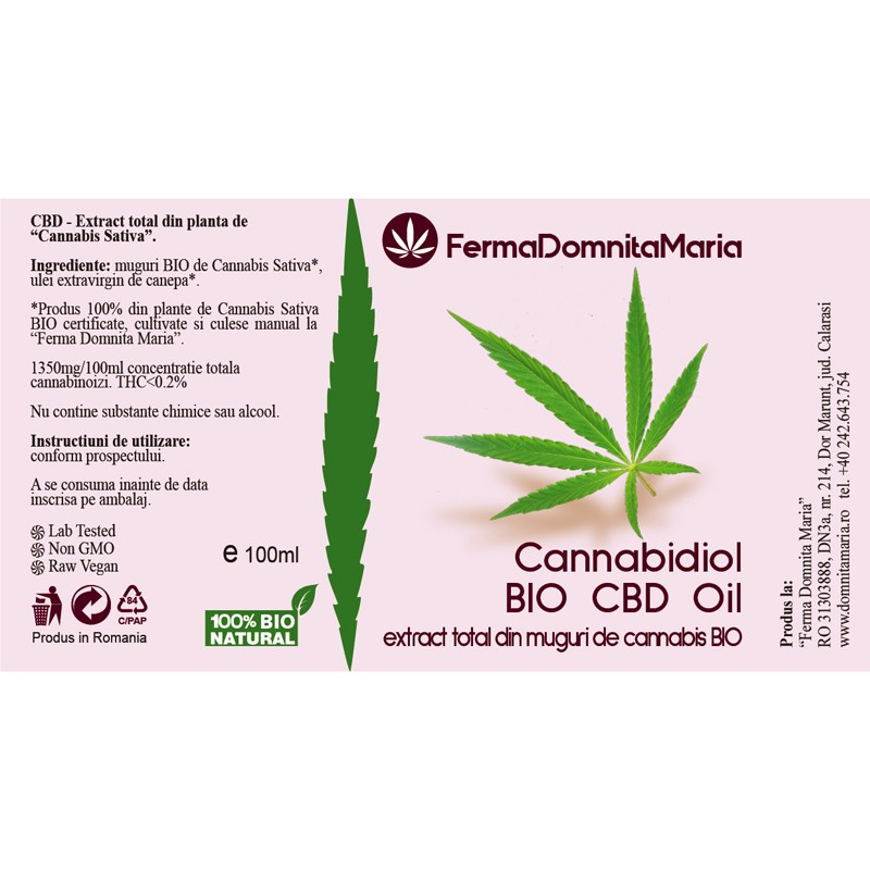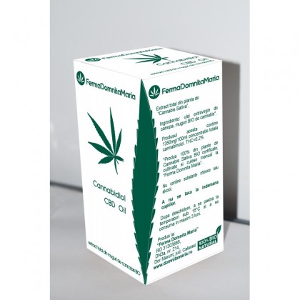Ulei CBD® 1350mg total Cannabinoizi sticla. Ulei CBD (CBD OIL)- obtinut fara procedee chimice cu alcool/ co2. Produs din canepa, atent selectionata. Strain de CBD cultivat la ferma in Dor Marunt, jud Calarasi. Sticla de 100 ml contine 1350 mg cbd.