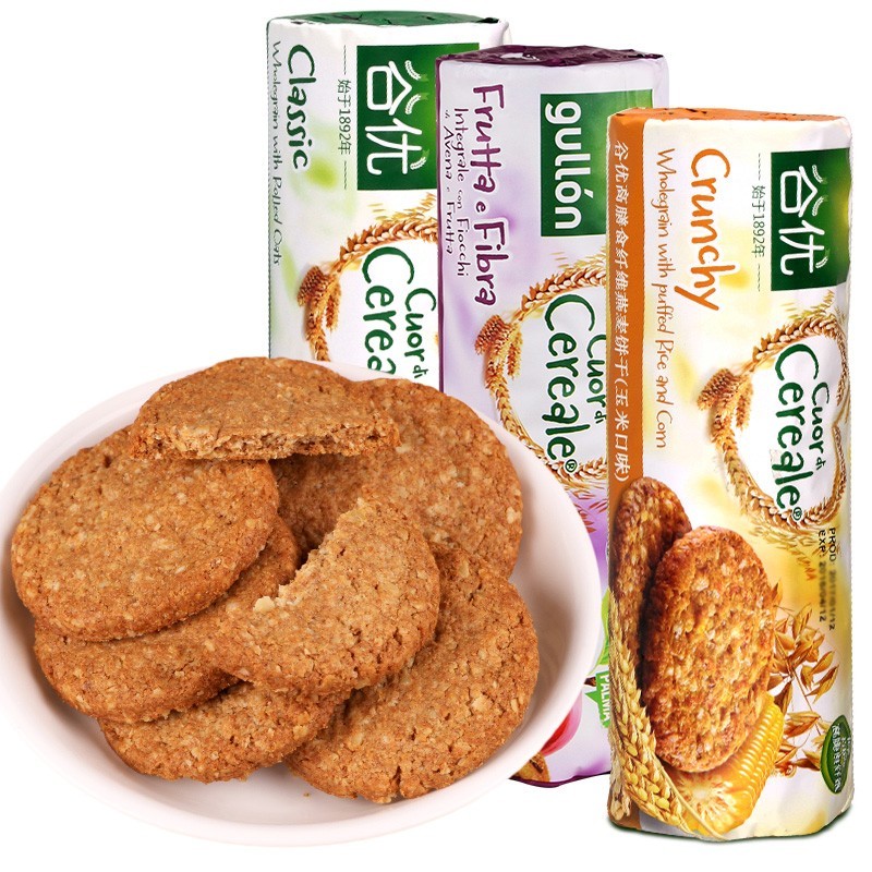 Ingrediente: fulgi de ovăz 36%. Făină integrală de grâu 26%, ulei vegetal de floarea soarelui high oleic 16%, zahăr, glucoză și sirop de fructoză, fibre vegetale, agenți de creștere (carbonat de sodiu hidrogen și carbonat de acid de amoniu), sare, antioxidanți (extract bogat în tocoferol ), aroma de vanilie.