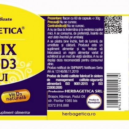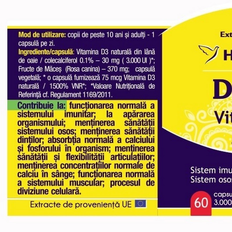 Ingrediente: vitamina D3 naturala din lana de oaie/colecalciferol 0.1%- 30 mg (3000ui), fructe de maces-370mg, capsula vegetala*.