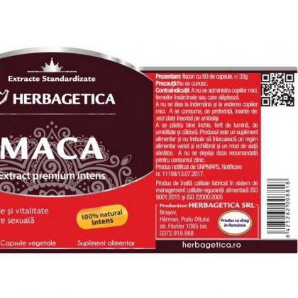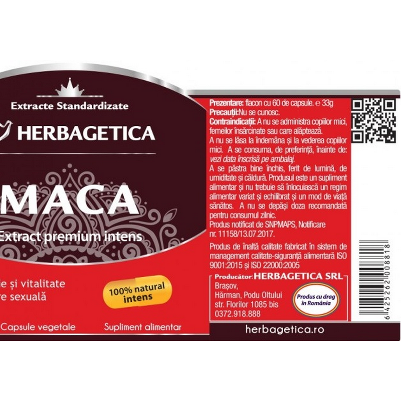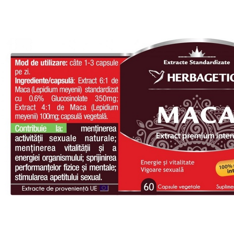 Ingrediente/ Compozitie per 1 capsula: extract 5-6:1 standardizat din tuberculi de Maca cu 0.6% glucosinolate 350 mg, extract uscat 4:1 din tuberculi de Maca 100 mg, capsula gelatina.