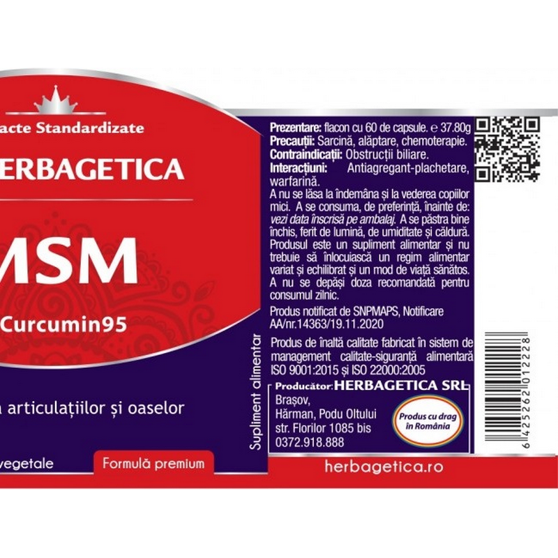 MSM - 500 mg MSM/capsulă. Formulă complexă cu MSM și Curcumin95 pentru refacerea mobilității și flexibilității articulare.