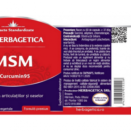 Produsul MSM are o formulă complexă concentrată pentru refacerea mobilității și flexibilității articulare. Conține 500 mg MSM/capsulă și 30 mg Curcumin95/capsulă. Combinația celor două ingrediente din MSM acționează eficient pentru a reduce inflamația articulară, pentru a preveni leziunile articulare sau musculare și pentru a stimula refacerea țesutului cartilaginos. Astfel, MSM este eficient pe mai multe căi de acțiune redând mobilitatea și flexibilitatea persoanelor care au probleme osteoarticulare.