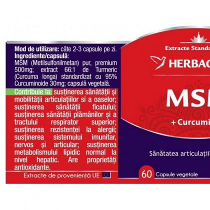 Ingrediente/Compoziție per 1 capsulă: MSM (Metilsulfonilmetan) pur premium 500mg, Turmeric (Curcuma Longa) standardizat cu 95% curcuminoide 30 mg, capsula gelatina.