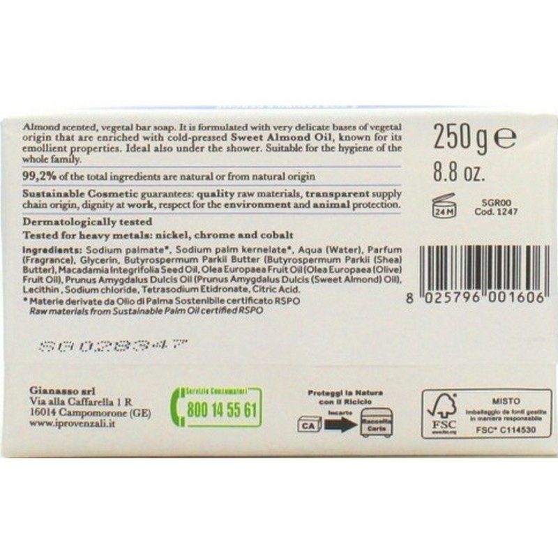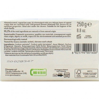 Este un sapun prelucrat artizanal , pur si vegetal, creat dupa metodele stravechi folosite in laboratoarele artizanale. Creat pe baza de origine vegetala, imbogatit cu adevaratul ulei de migdale dulci presat la rece, cu calitati emoliente si hidratante. Este un sapun cu 99.2% cu ingrediente naturale sau de origine naturala.