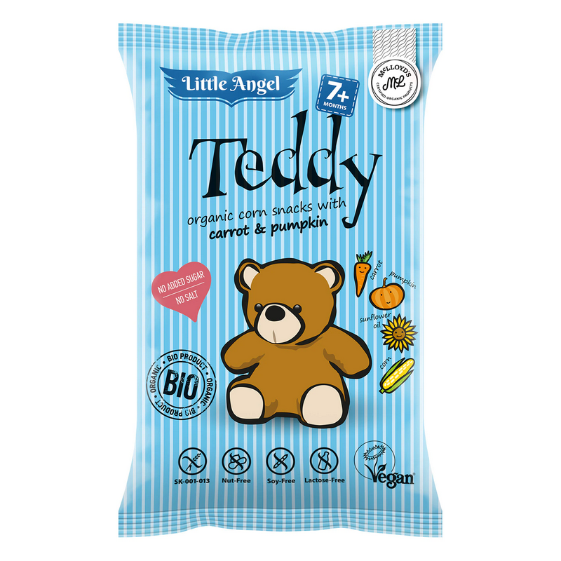 Snacksurile ecologice Teddy cu morcovi si dovleac sunt special concepute pentru bebelusi, continand ingrediente de cea mai inalta calitate, din productie ecologica. Nu sunt doar excelente ca gust, ci au si forma de ursuleti, astfel ca bebelusii vor fi foarte incantati de acest produs. Parintii vor fi de asemenea incantati, deoarece produsul nu contine adaos de zahar sau de sare, dar nici o serie importanta de alergeni.
