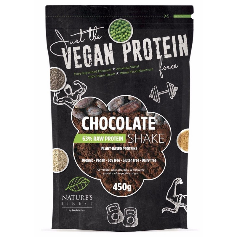 Proteine complete de origine vegetală, gustoase și ușor de consumat într-un amestec de aromă de ciocolată. 63% bază de proteine formată din mazăre puternică, orez integral, proteine Chia și Quinoa.