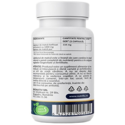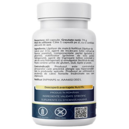 Ingrediente: Lăptișor de matcă liofilizat echivalent cu 1000 mg lăptișor de matcă pur (lăptișor de matcă pur 3:1), agent de încărcare (Ulei rafinat de floarea soarelui), componentele perlei (gelatină și glicerină), stabilizator (grăsime de soia parțial hidrogenată), agent de îngroșare (silice coloidală și ulei de soia hidrogenat) și emulgator (lecitină din soia). Poate conține urme de gluten, ouă, lapte și pește.