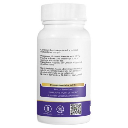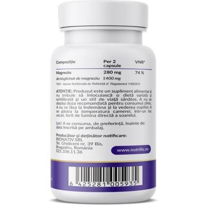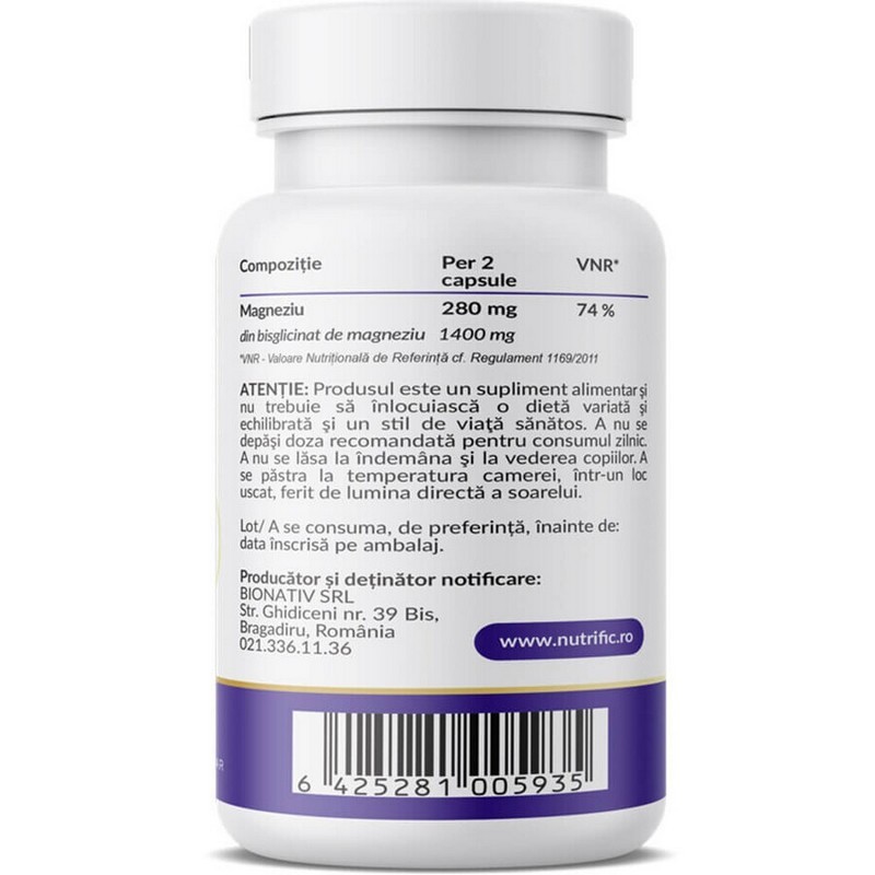 Ingrediente: Magneziu (bisglicinat de magneziu) – 140 mg/37,3% VNR; capsulă vegetală: hidroxipropilmetilceluloză.