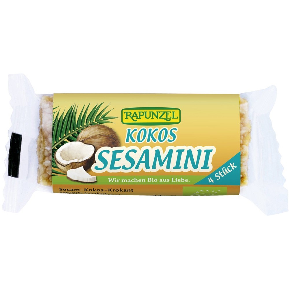 Batoane crocante de susan cu cocos ras. Din zahar din trestie de zahar Rapadura zahar din trestie de Cristallino sirop de orez si fulgi de nuca de cocos se prepara o masa caramel si se amesteca cu susan prajit crocant.