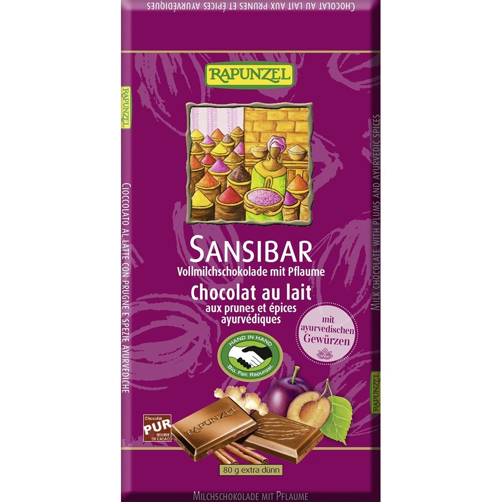 Ingrediente: zahar integral din trestie, zahar de trestie, lapte praf integral, 22%, unt de cacao, masa de cacao, prune liofilizate 4%, amestec de condimente 0,7%( scortisoara, coriandru, ghimbir), emulgator lecitina de soia, vanilie bourbon, minim 36% cacao