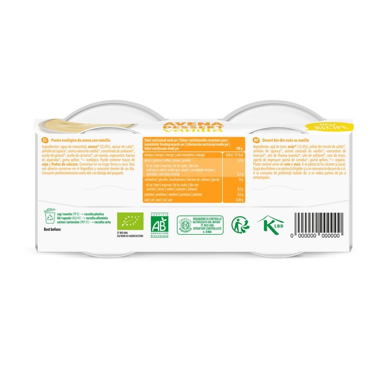 Ingrediente: apa naturala de izvor, ovaz* (12.4%), zahar din trestie de zahar*, amidon de tapioca*, aroma naturala de vanilie*, concentrat de morcovi*, ulei de floarea soarelui*, ulei de sofranel*, sare de mare, agenti de ingrosare: guma de carruba*, guma gellan.