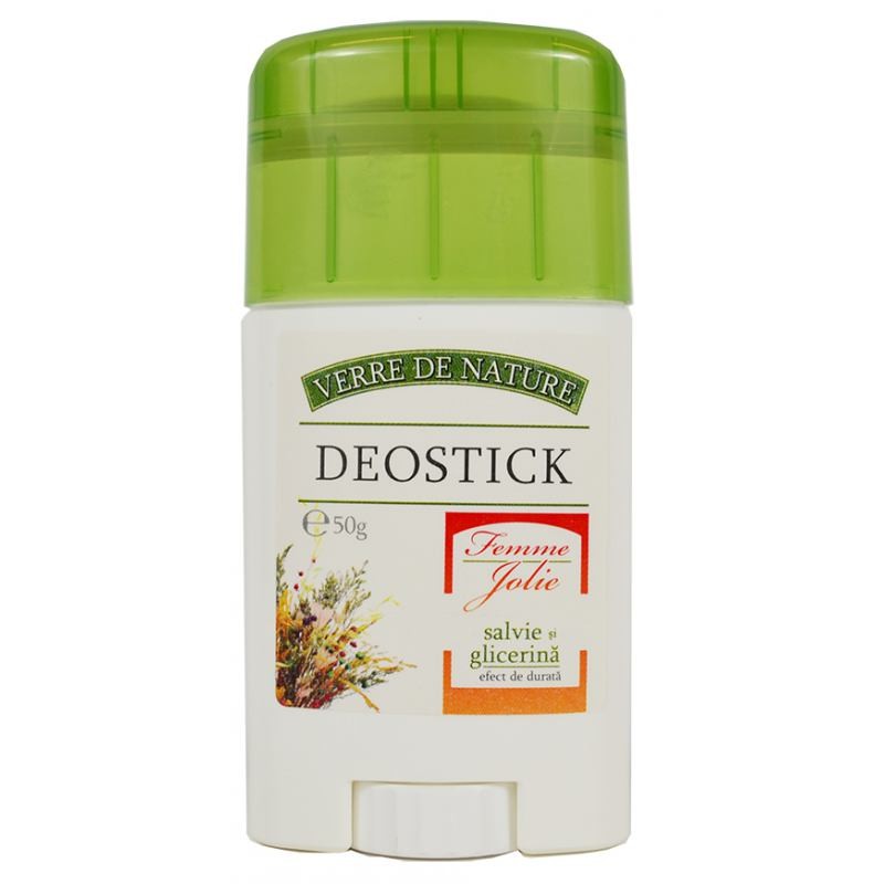 Deo stick „Femme Jolie – Verre de Nature”, deodorant solid cu extract natural de salvie, glicerina si provitamina B5. Extractul de salvie asigura o protectie continua timp de 24 de ore, reduce transpiratia si impiedica aparitia mirosului neplacut.